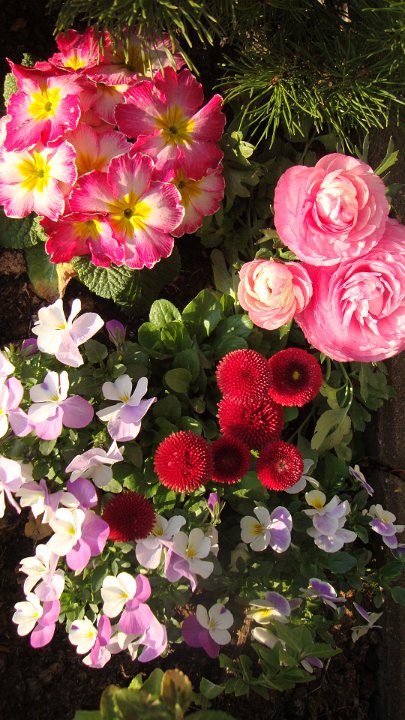 Violen, Ranunkeln, Primeln, Bellis, Narzissen, usw. bringen nach dem langen Winter wieder Farbe nach Hause, in den Garten oder aufs Grab.